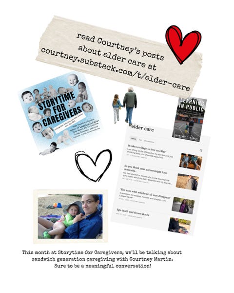 Hey friends, if you’re in the Bay Area, I’ve got a fun event coming up. It’s called Storytime for Caregivers, Tuesday March 17, 10am, at Local Economy. We’ll talk a bit about Learning in Public, but even more about sandwich generation caregiving and more of my recent writing here at Examined Family. Can’t wait to hang and hold your babies.
